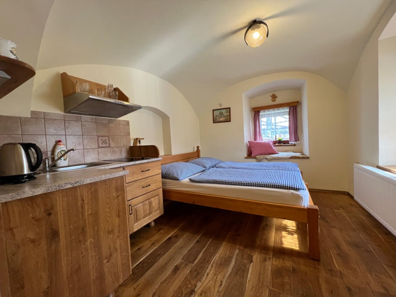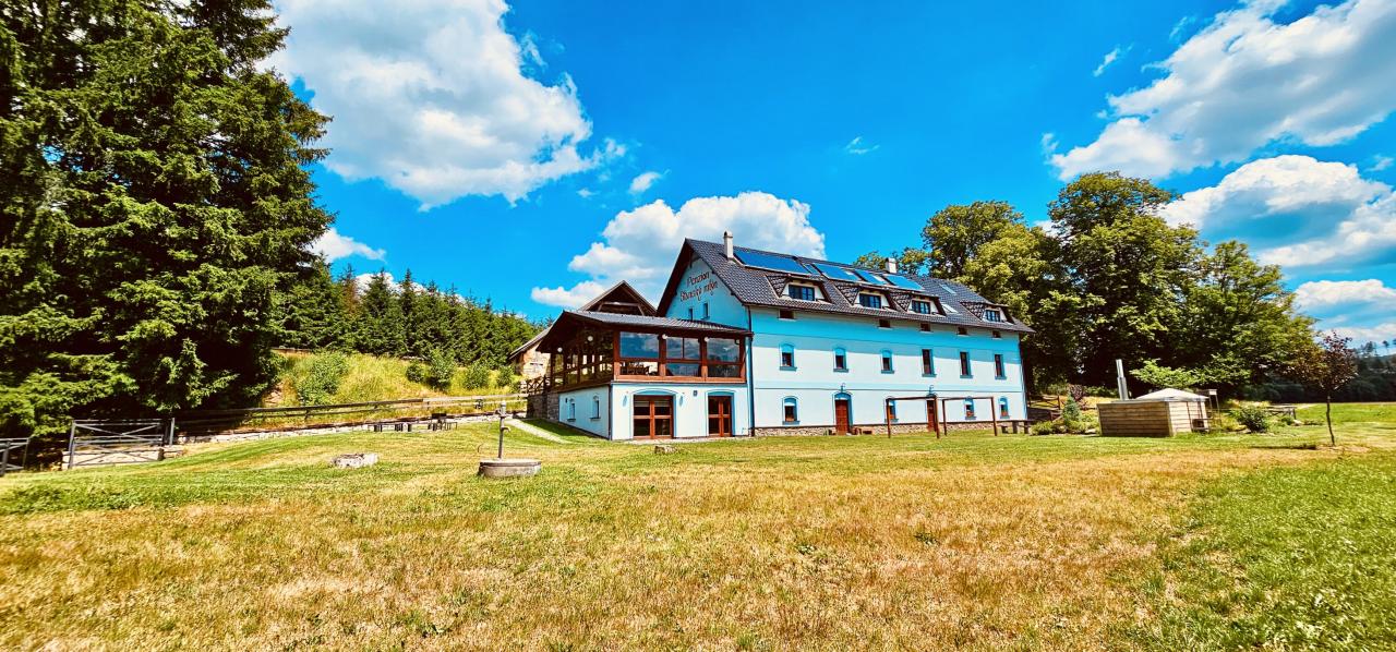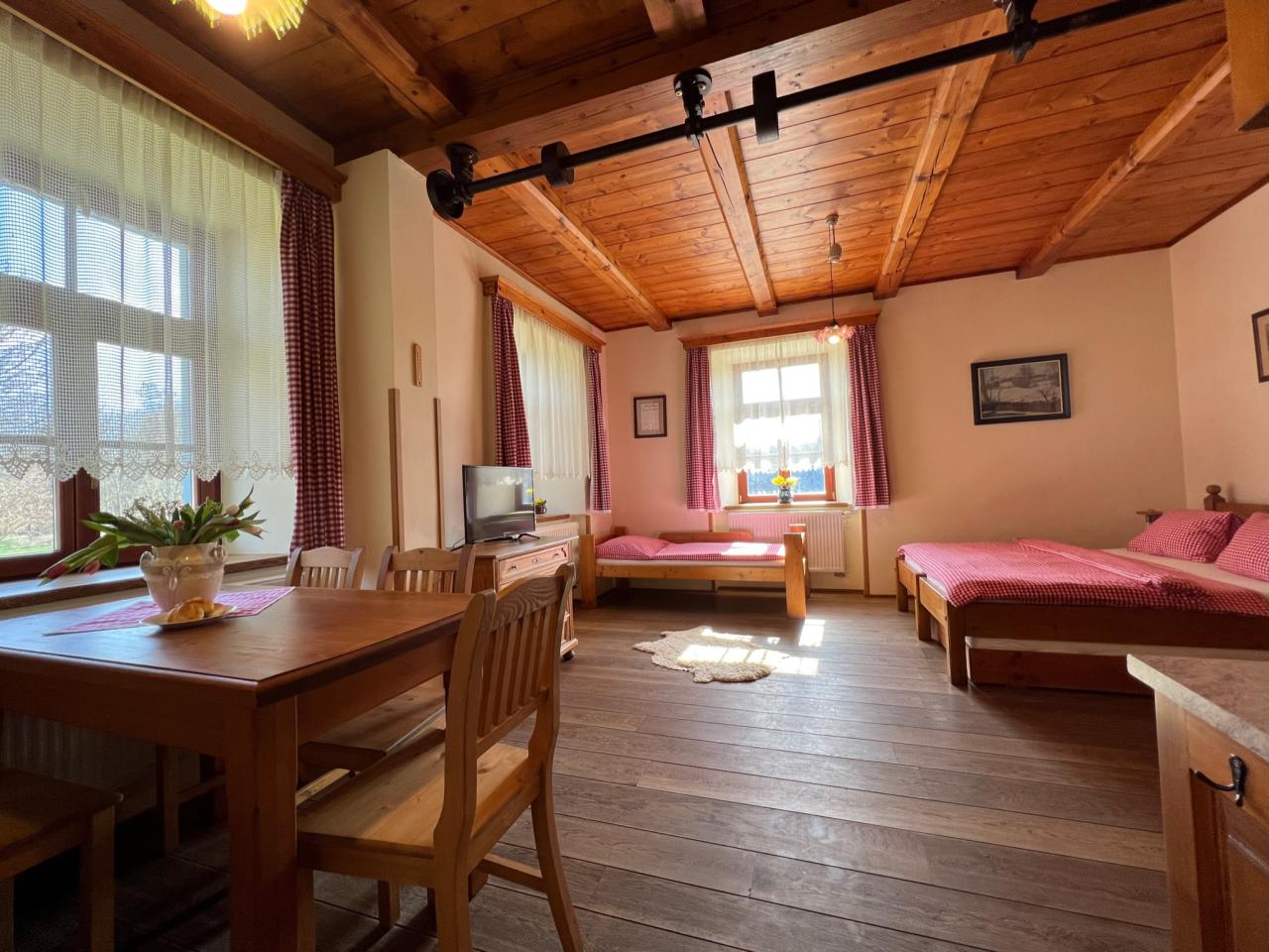 Náš rodinný penzion Vám nabízí celoroční ubytování s celkovou kapacitou 21 lůžek, rozdělených do 3 samostatných a stylově vybavených apartmánů a 2 pokojů. V každém apartmánu je možnost jedné a více plnohodnotné přistýlky - pevného, pohodlného lůžka. Celková ubytovací kapacita včetně přistýlek je 30 lůžek. Všechny apartmány jsou komfortně vybaveny selským nábytkem a disponují vlastní kuchyní, ložnicí, koupelnou a WC. Samozřejmostí každého apartmánu je také televizor, bezdrátové připojení k internetu, lednička, mikrovlnná trouba a kompletně zařízená kuchyň. Dále můžeme našim hostům nabídnout ubytování ve 2 pokojích, z nichž jeden je dvoulůžkový a jeden třílůžkový. Samozřejmostí každého pokoje je také televizor, bezdrátové připojení k internetu, lednička, mikrovlnná trouba a kompletně zařízený kuchyňský kout. Dobovou atmosféru ve všech apartmánech a pokojích dotváří původní trámy a vazby, stylový nábytek a dubové podlahy. Hostům je také k dispozici společenská místnost s barem a velkou kuchyní a dále prosklená terasa s výhledem do okolní krajiny. Tyto prostory jsou ideální pro pořádání rodinných, nebo firemních setkání a svateb.