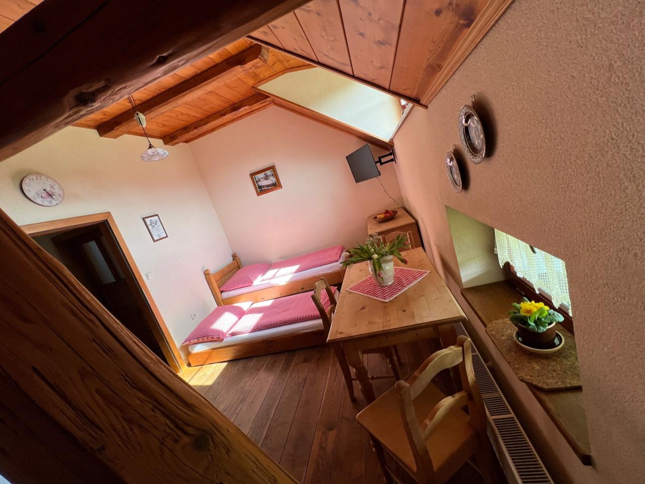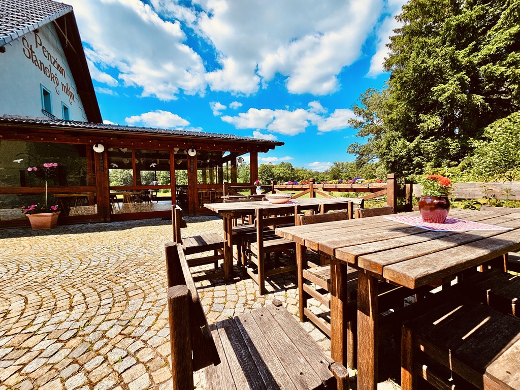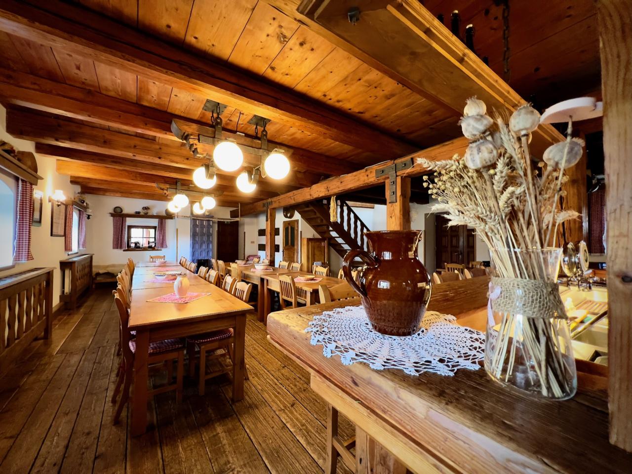 Náš rodinný penzion Vám nabízí celoroční ubytování s celkovou kapacitou 21 lůžek, rozdělených do 3 samostatných a stylově vybavených apartmánů a 2 pokojů. V každém apartmánu je možnost jedné a více plnohodnotné přistýlky - pevného, pohodlného lůžka. Celková ubytovací kapacita včetně přistýlek je 30 lůžek. Všechny apartmány jsou komfortně vybaveny selským nábytkem a disponují vlastní kuchyní, ložnicí, koupelnou a WC. Samozřejmostí každého apartmánu je také televizor, bezdrátové připojení k internetu, lednička, mikrovlnná trouba a kompletně zařízená kuchyň. Dále můžeme našim hostům nabídnout ubytování ve 2 pokojích, z nichž jeden je dvoulůžkový a jeden třílůžkový. Samozřejmostí každého pokoje je také televizor, bezdrátové připojení k internetu, lednička, mikrovlnná trouba a kompletně zařízený kuchyňský kout. Dobovou atmosféru ve všech apartmánech a pokojích dotváří původní trámy a vazby, stylový nábytek a dubové podlahy. Hostům je také k dispozici společenská místnost s barem a velkou kuchyní a dále prosklená terasa s výhledem do okolní krajiny. Tyto prostory jsou ideální pro pořádání rodinných, nebo firemních setkání a svateb.