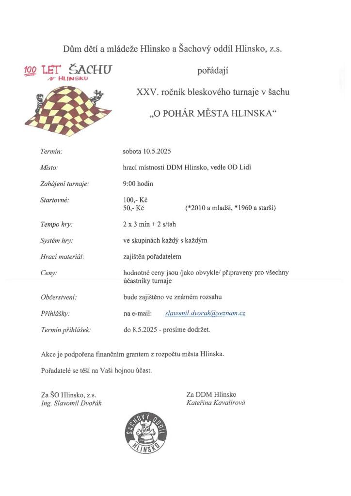 Dům dětí a mládeže Hlinsko a Šachový oddíl Hlinsko zvou na XXV. ročník bleskového turnaje v šachu O pohár města Hlinska. Vstupné je 100 Kč a 50 Kč. Občerstvení zajištěno. Přihlášky do 8. května 2025.