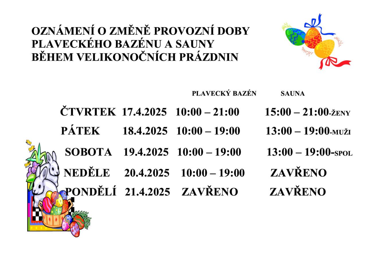 Vážení návštěvníci, během velikonočních prázdnin dojde ke změně provozní doby plaveckého bazénu a sauny. Bazén bude otevřen od 17. do 20. dubna s různými časy, sauny budou mít také omezenou otevírací dobu. V pondělí 21.4. bude zavřeno.