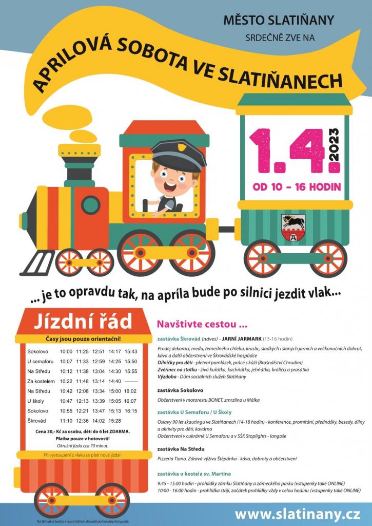 Na apríla bude jezdit vlak po silnici! Jarmark, oslavy 90 let skautingu ve Slatiňanech, občerstvení. Prohlídky zámku a stájí.