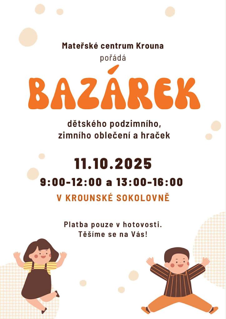 Mateřské centrum Krouna vás srdečně zve na bazárek dětského podzimního a zimního oblečení a hraček. Můžete se těšit na široký výběr oblečení a hraček pro vaše nejmenší. Přijďte si vybrat to nejlepší a potkat další rodiče. Platba je možná pouze v hotovosti.