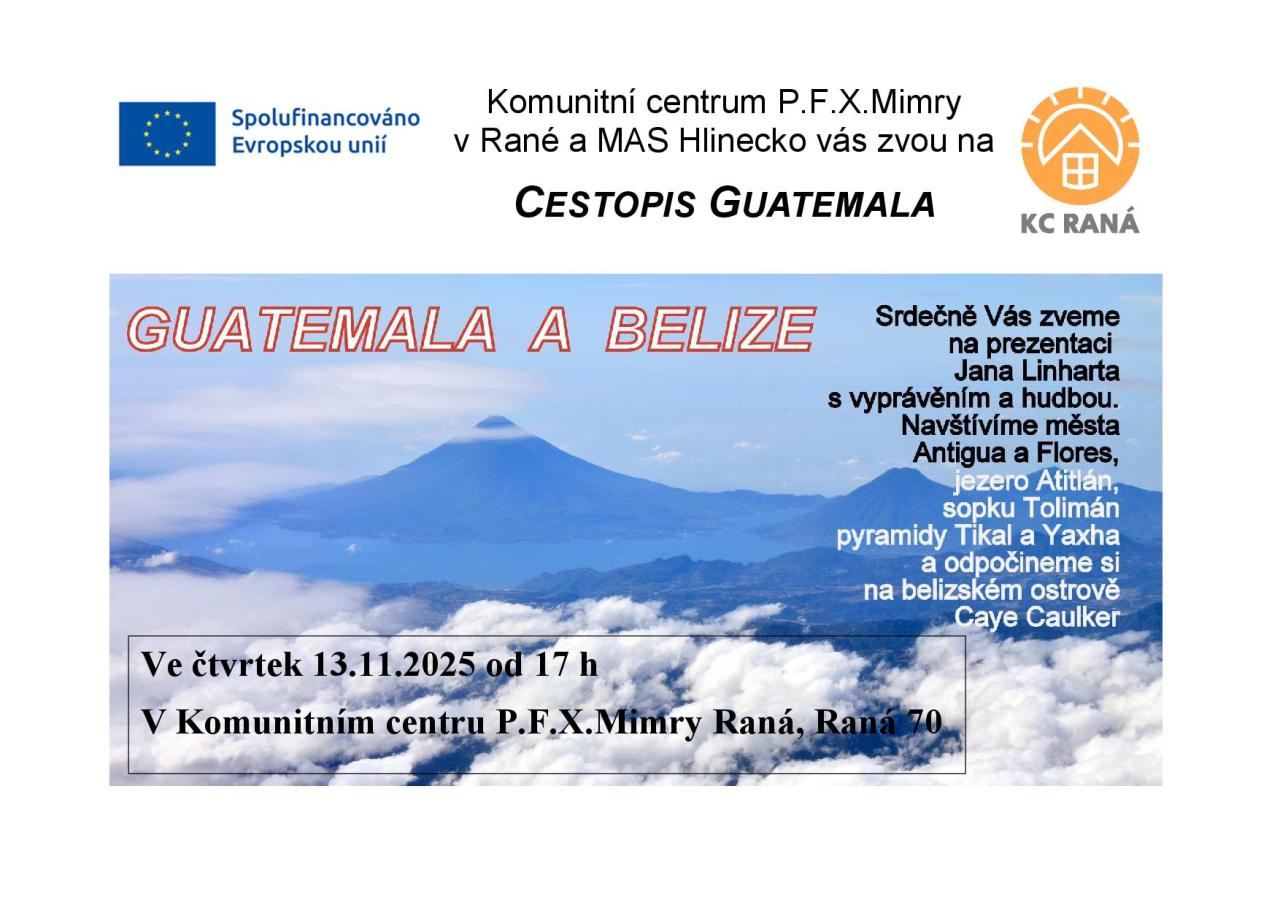 Zveme vás na prezentaci cestopisu s vyprávěním a hudbou, kterou povede Jan Linhart. Dozvíte se o sopce Tolimán, pyramidách Tikal a Yaxhá a vychutnáte si odpočinek na ostrově Caye Caulker.