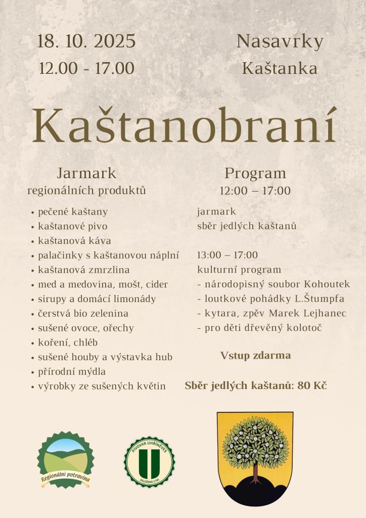 Jarmark regionálních produktů, sběr jedlých kaštanů, kulturní program - loutkové pohádky, národopisný soubor Kohoutek, kytara a zpěv Marek Lejhanec.