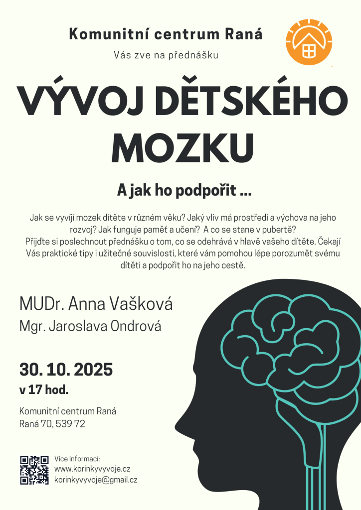 Zveme vás na přednášku o vývoji dětského mozku a jak ho podpořit. Odbornice MUDr. Anna Vašková a Mgr. Jaroslava Ondrová vám přiblíží, jak se mozek dítěte vyvíjí v různých věkových obdobích a jaký vliv na něj má okolní prostředí a výchova.