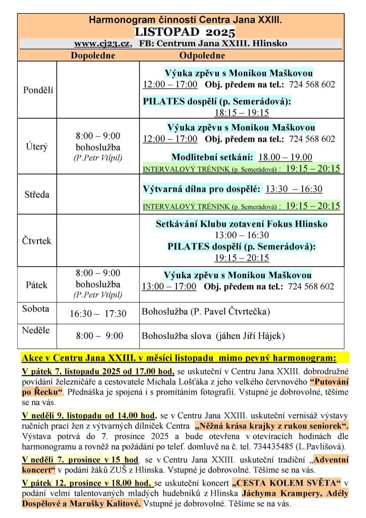 Můžete se těšit na výuku zpěvu, pilates, intervalové tréninky a výtvarné dílny. Speciální akce zahrnují povídání Michala Lošťáka o jeho putování po Řecku, vernisáž výstavy ručních prací a tradiční adventní koncert. Vstupné na většinu akcí je dobrovolné.