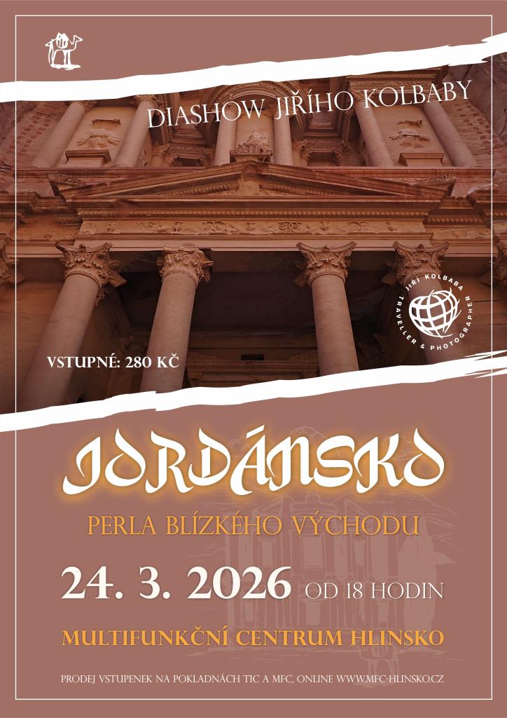 Zveme na diashow Jiřího Kolbaby, která se koná 24. března 2026. Vstupné je 280 Kč a vstupenky jsou k dispozici na pokladnách TIC a MFC, stejně jako online na webových stránkách www.mfc-hlinsko.cz.