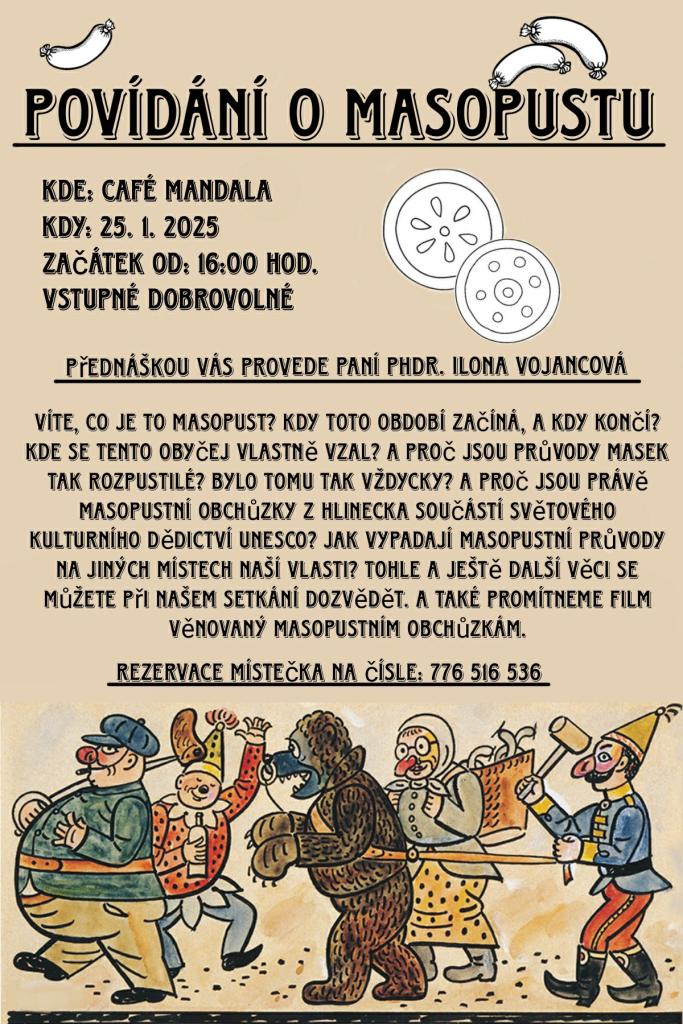 Přednášku povede paní PhDr. Ilona Vojancová. Víte, co je to masopust? Kdy toto období začíná a kdy končí? Kde se tento obyčej vlastně vzal? Toto a další věci se dozvíte na tomto zajímavém povídání.