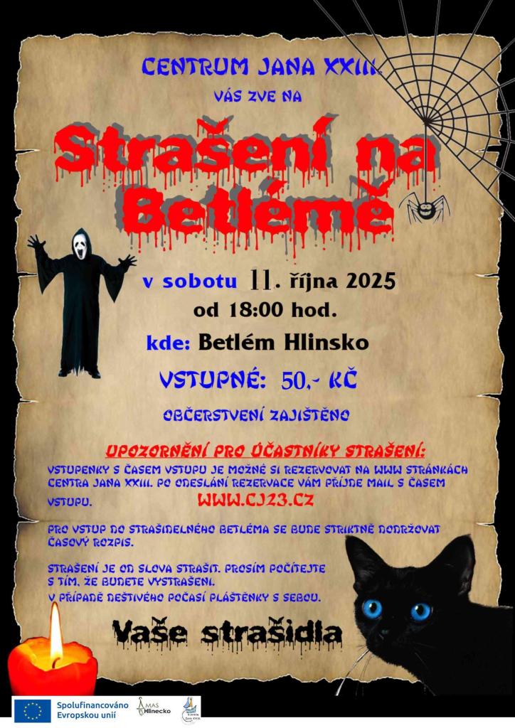 Centrum Jana vás zve na strašidelný Betlém, který se koná 11. října 2025 od 18:00 hodin. Vstupné je 50 Kč a občerstvení je zajištěno. Rezervace vstupenek s časem vstupu je dostupná na webových stránkách centra. Prosíme, abyste dodržovali časový rozpis pro vstup do strašidelného Betléma.
