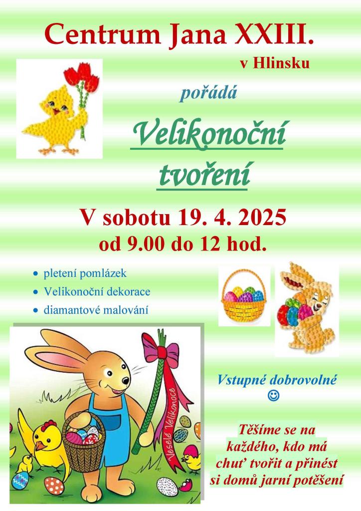 Centrum Jana XXIII. vás zve na velikonoční tvoření, které se uskuteční v sobotu 19. dubna 2025 od 9:00 do 12:00. Přijďte si užít pletení pomlázek, výrobu jarních dekorací a diamantové malování. Vstupné dobrovolné.