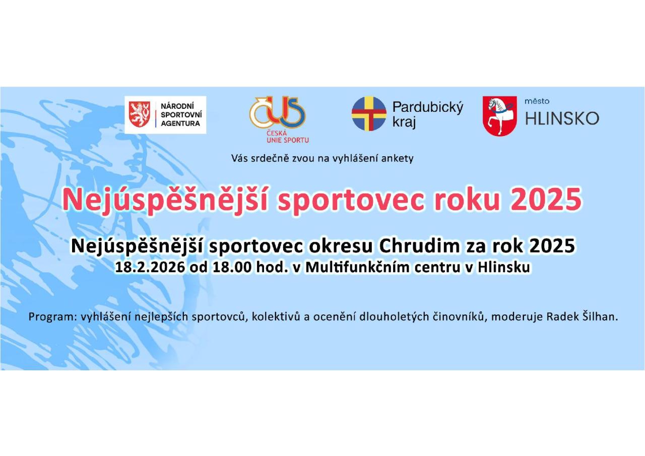 Česká unie sportu a Pardubický kraj vás zvou na slavnostní vyhlášení ankety Nejúspěšnější sportovec roku 2025. V rámci programu budou oceněni nejlepší sportovci a kolektivy okresu Chrudim.